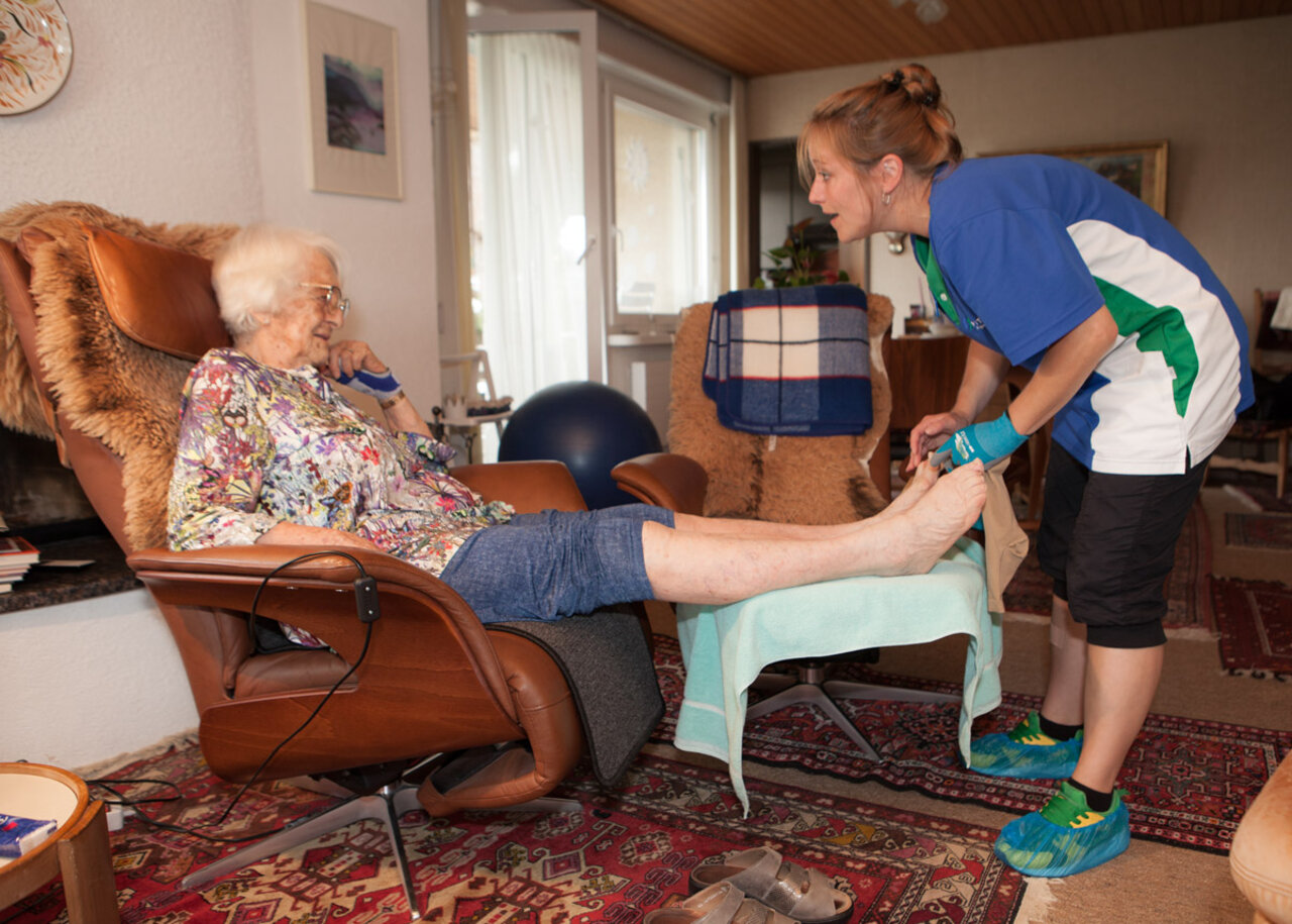 Pflegerisches Fachpersonal sorgt zu Hause für die erforderliche menschliche und pflegerische Hilfe. Durch die ärztliche Anordnung erfolgt ein wesentlicher Teil der Finanzierung durch die Grundversicherung der Krankenversicherung.